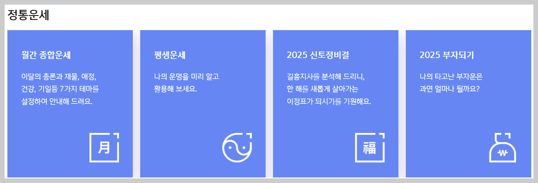 - 원하는 항목 선택 (정통운세 / 생활운세 / 궁합 등)
