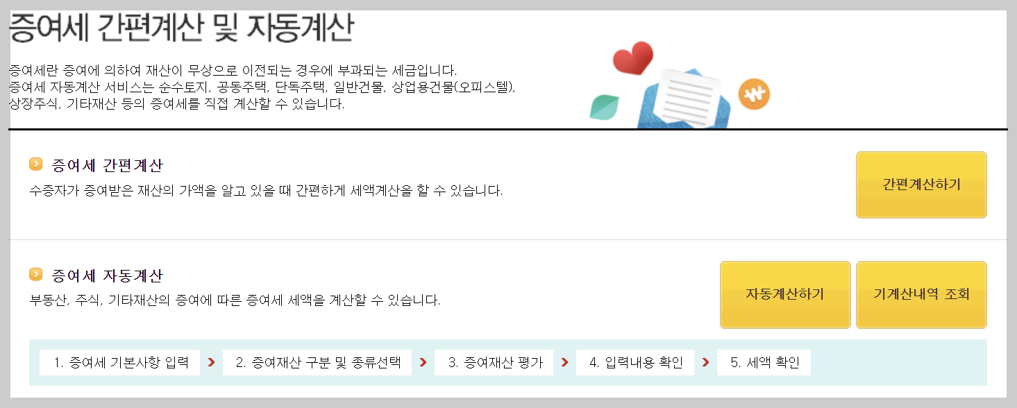 증여세 모의 계산은 홈택스 사이트 증여세 모의계산 메뉴에서 간편하게 하실 수 있습니다.