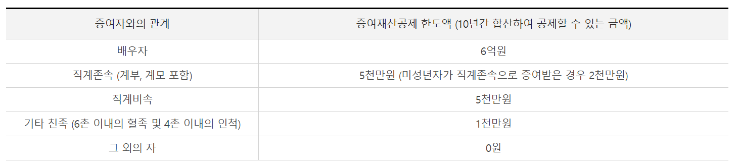 증여세는 증여자와의 관계에 따라 한도액이 달라집니다. 배우자의 경우 10년간 합산하여 공제할 수 있는 금액이 6억 원, 직계존속(부모님)의 경우 5천만 원, 기타 친족은 1천만 원입니다.