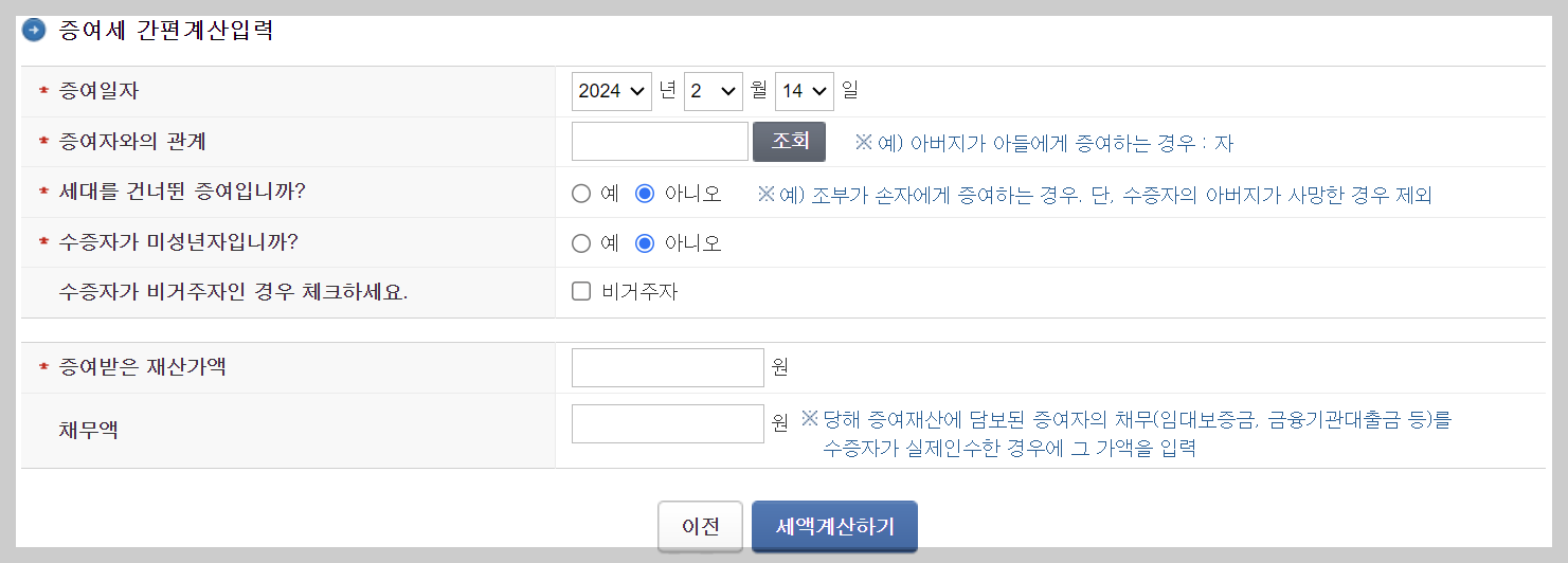 증여받는 재산에 대해 정확하게 입력하면 보다 정확한 증여세를 알 수 있게 됩니다.