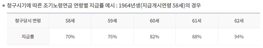 1965년생의 경우 64세에 노령연금이 개시됩니다만, 조기노령연금으로 5년 일찍 받고 싶다면 58세인 2023년부터 지급개시할 수 있습니다.