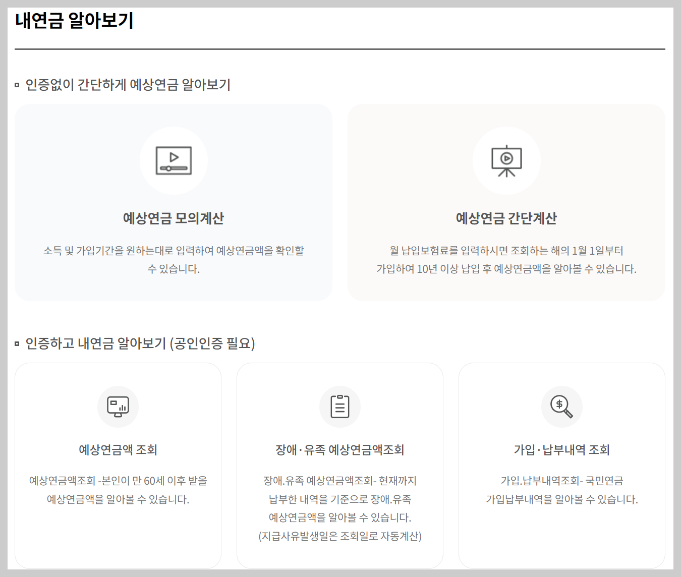 국민연금공단 사이트에서는 공인인증서없이도 간단하게 예상연금 수령액을 확인할 수 있습니다. 공인인증서로 로그인 시에는 그동안 납부한 전체 납부내역과 예상수령액을 더 정확하게 알 수 있습니다.