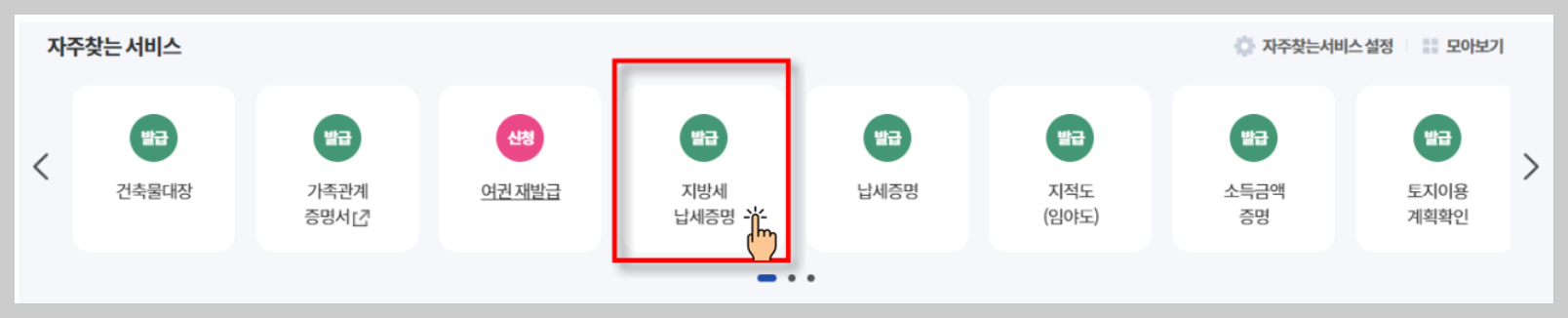 지방세 납세증명 발급을 위해서는 정부24 사이트 자주찾는 서비스에서 지방세 납세증명을 클릭합니다.