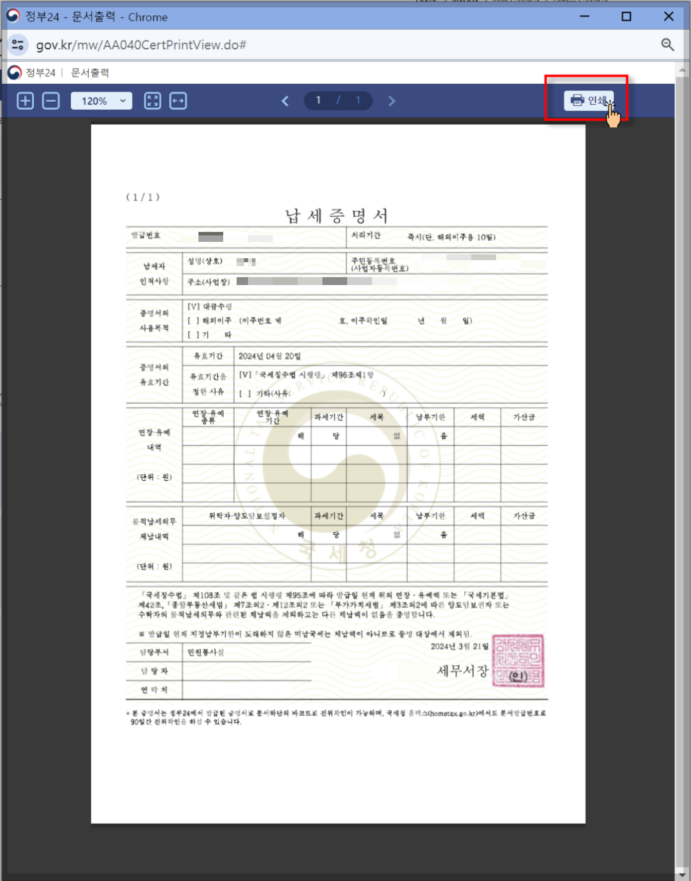 인증서 확인을 거치면 아래와 같이 국세 납세증명서가 바로 발급됩니다.