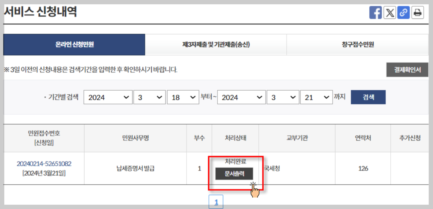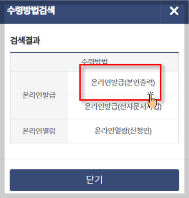 이때 바로 출력을 원하시면 수령방법에서 온라인발급(본인출력)을 선택하시면 됩니다.