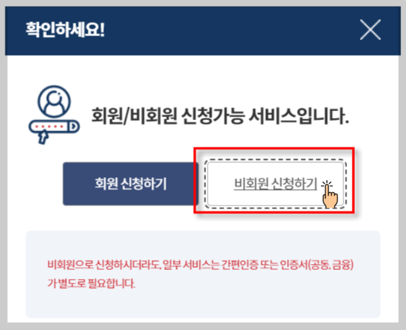 비회원 신청시 개인정보 수집에 동의버튼을 누르고 이름과 주민번호 연락처 입력확인 번호를 누르시면 비회원으로도 납세증명서 발급이 가능합니다.