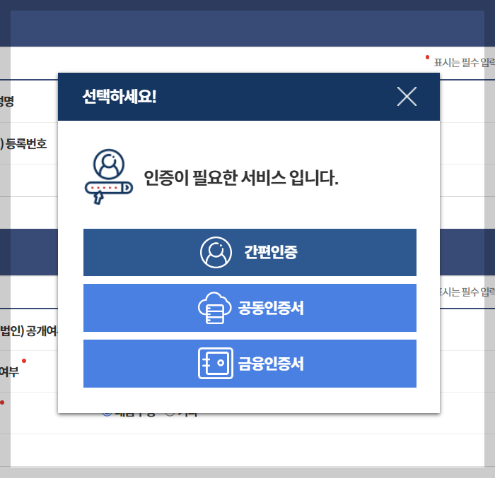 민원신청하기 버튼을 누르면 위와같이 인증 화면이 다시 나오게 됩니다. 납세증명서는 본인확인 및 인증서가 꼭 있어야 신청이 가능합니다.