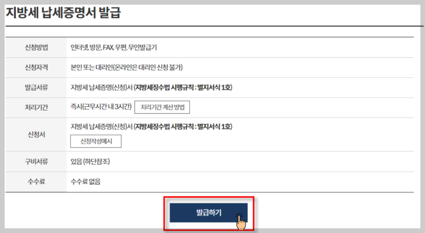 지방세 납세증명서 발급도 국세 납세증명서 발급과 동일합니다. 비회원 신청 가능하며, 발급 마지막 단계에서 인증서 로그인이 요구됩니다. 발급은 근무시간내 발급시 즉시 발급됩니다.