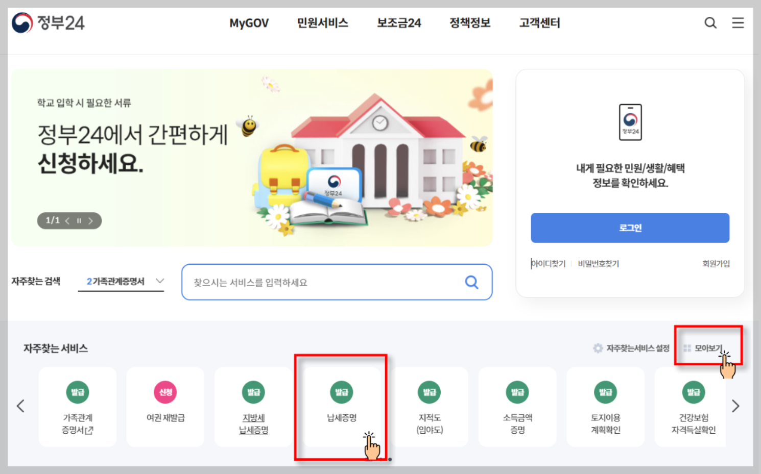 정부24 사이트로 이동하여 메인 화면 자주찾는 서비스에서 납세증명을 확인합니다. 회원가입이나 로그인은 하지 않으셔도 발급 가능합니다.