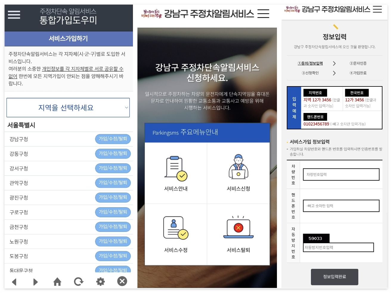 가입방법을 아주 간단합니다. 차량번호와 연락받을 핸드폰번호, 자동방지번호만 입력하시면 가입이 완료됩니다. 1분 정도의 시간이면 주정차 단속으로 인한 스트레스에서 벗어나실 수 있으니 꼭 가입하셔서 이용하시기 바랍니다.