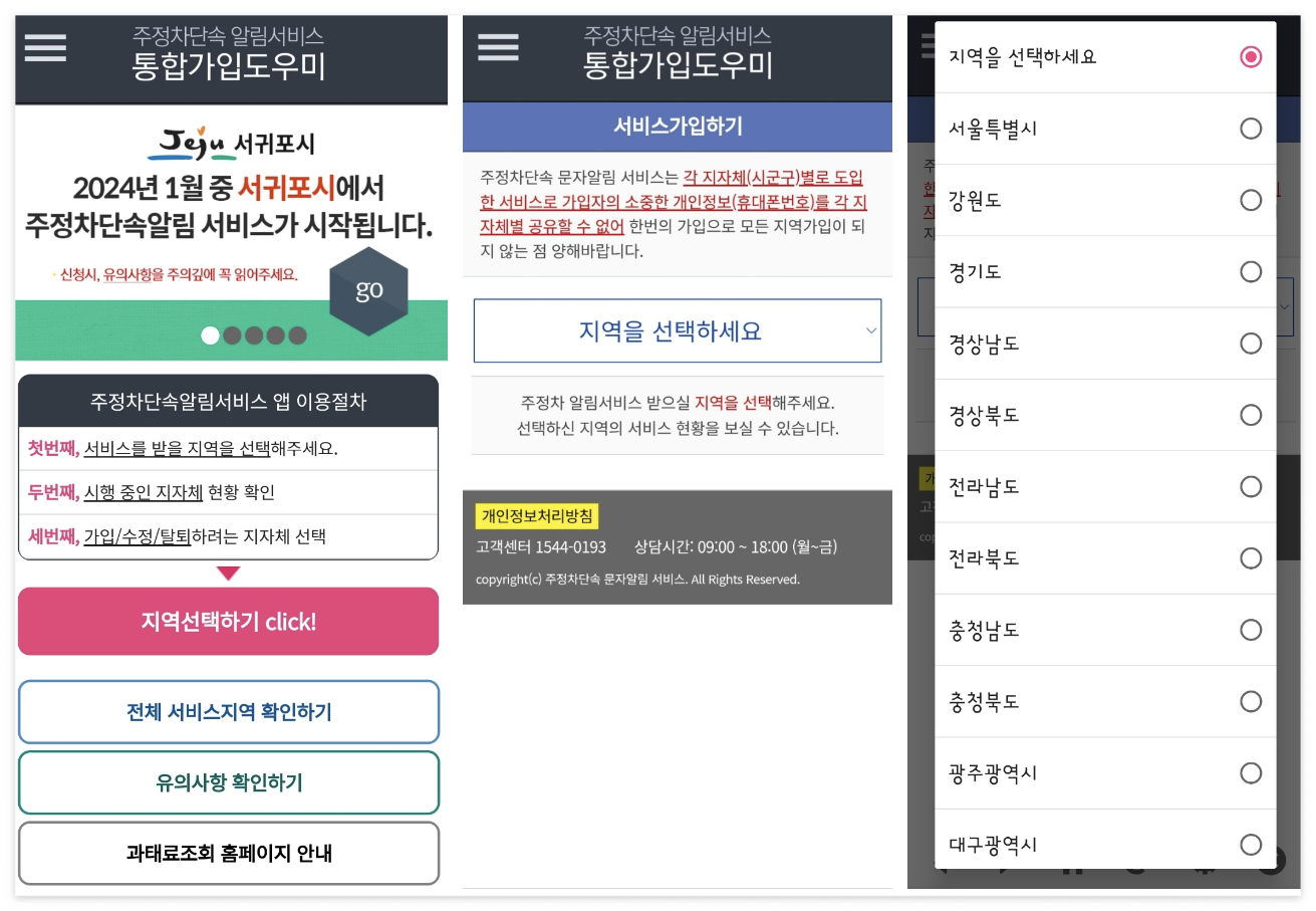 설치 후, 먼저 서비스를 받을 지역을 선택합니다. 자주 방문하는 지역을 선택하시면 되는데 각 지자체별로 개인정보를 공유하지 않기 때문에 지역별로 각각 가입하셔야 서비스를 이용하실 수 있습니다.